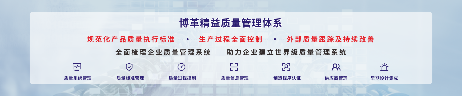 博革咨詢的精益質量系統包含了質量系統管理、質量標準管理、質量過程控制、質量信息管理、制造程序認證、供應商管理、早期設計集成7大部分內容,博革咨詢通過精益質量系統的診斷和流程優化,將幫助企業梳理在質量管理理念、工具方法、流程平臺、質量專家和質量文化等方面的優劣,幫助企業建立世界級的質量管理系統。