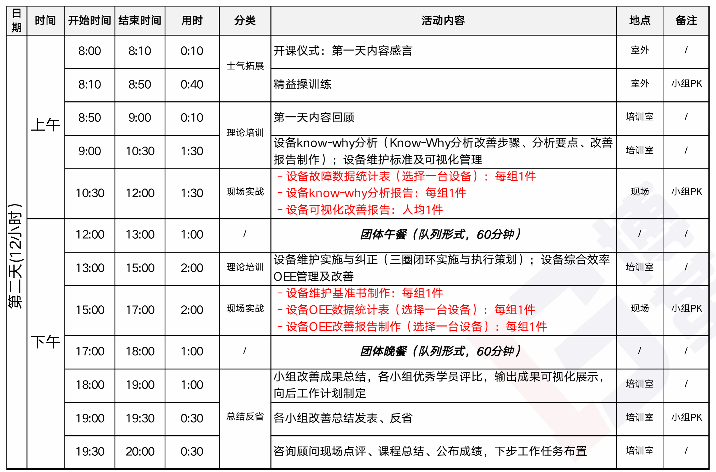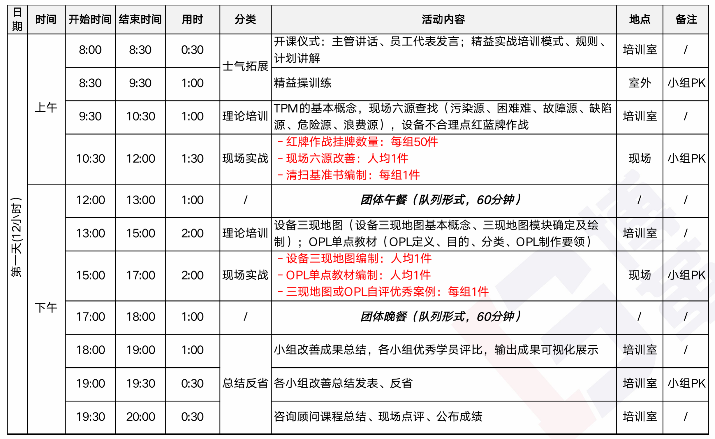 每次培訓會根據企業的需求選擇不同的主題,包含但不限于:現場5S、TPM、標準作業、六源改善、質量改善、快速切換、產線平衡、工位布置、浪費識別與改善、QC/IE工具應用等