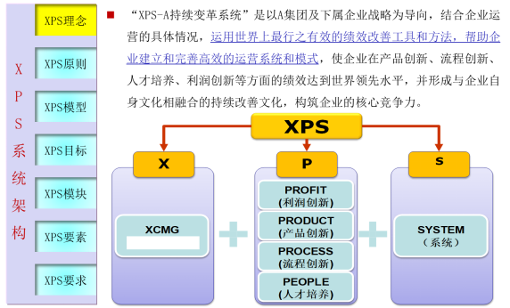 “XPS持續變革系統”是以集團及下屬企業戰略為導向,結合企業運營的具體情況,運用世界上最行之有效的績效改善工具和方法,幫助企業建立和完善高效的運營系統和模式,使企業在產品創新、流程創新、人才培養、利潤創新等方面的績效達到世界領先水平,并形成與企業自身文化相融合的持續改善文化,構筑企業的核心競爭力。