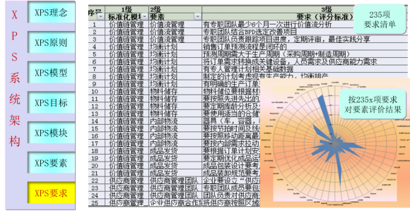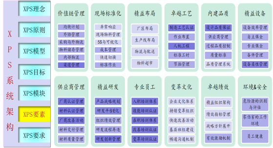 XPS持續變革系統分別從理念,原則,模型、目標、模塊、要素。要求等七個方面進行規劃和建模。既有深度,又有廣度,同時,建立評價要素和實施要求,也達到了集團戰略要求迅速推進精益變革的戰略要求。