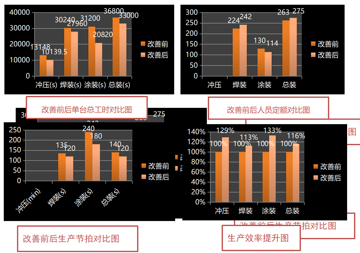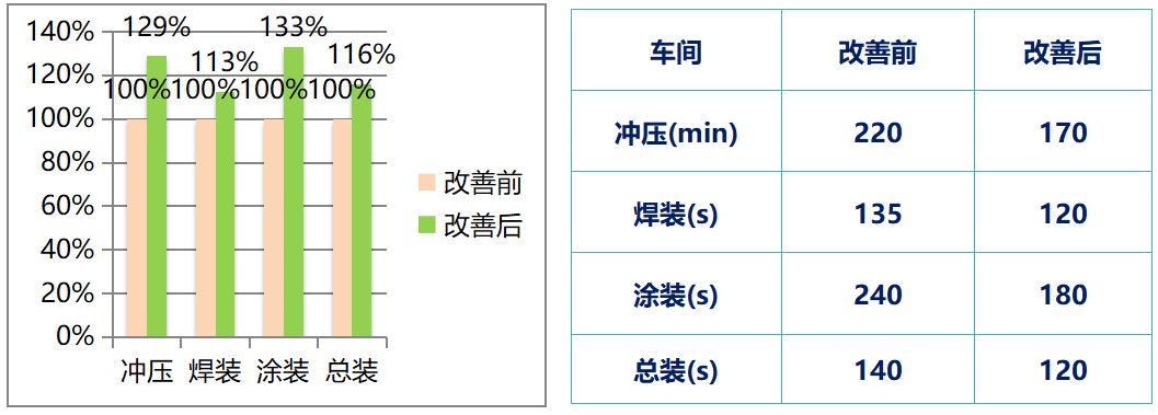 ? 總裝產(chǎn)能提升后標準時間(TT)為120S,生產(chǎn)效率提升16.6%