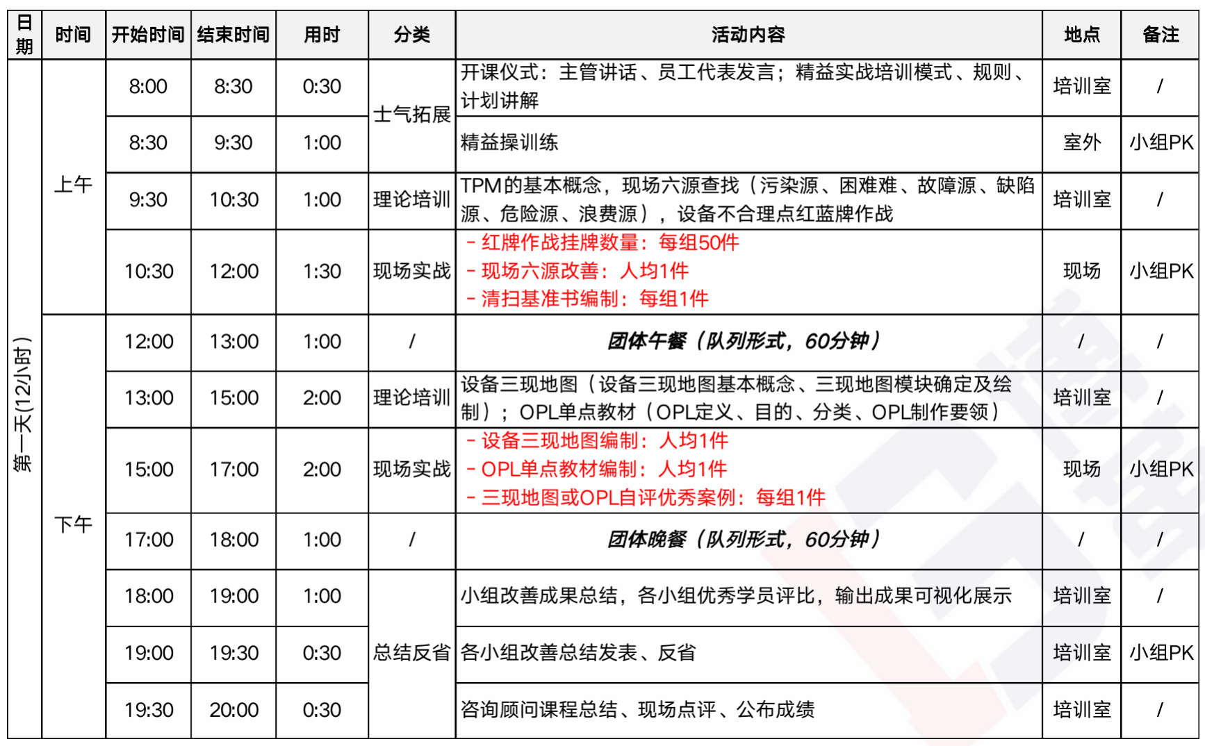 主題性:每次培訓會根據企業的需求選擇不同的主題,包含但不限于:現場5S、TPM、標準作業、六源改善、質量改善、快速切換、產線平衡、工位布置、浪費識別與改善、QC/IE工具應用等