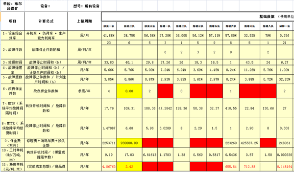 2015年年底,由礦機電辦制作在用采掘設(shè)備、主運輸設(shè)備履歷信息表模板下發(fā)各單位填寫、月度上報,包括設(shè)備總覽技術(shù)特征匯編、不同設(shè)備履歷分頁預(yù)覽,主要內(nèi)容有設(shè)備遷入、遷出時間、大型部件、備件更換情況、數(shù)量、更換原因等,為TPM設(shè)備保全管理提供了詳細的基礎(chǔ)資料、也為內(nèi)部調(diào)劑單位提供了詳細的設(shè)備服役期狀況參考,提升設(shè)備狀態(tài)把握水平